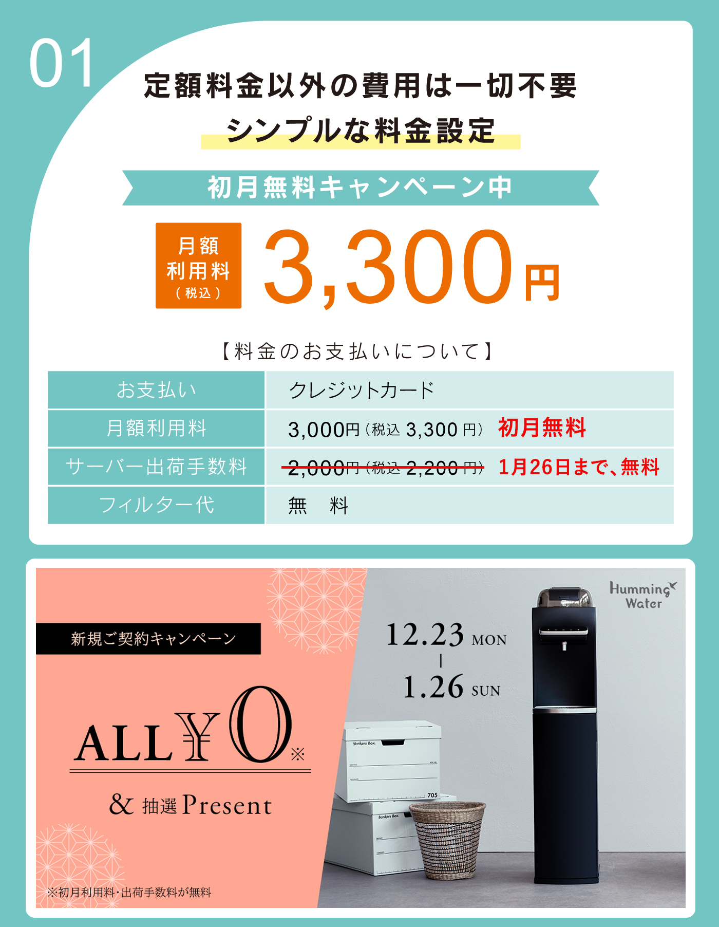 ハミングウォーターを新規お申込み頂いた方全員に、初月利用料金と初回出荷手数料が0円になるキャンペーンを開催!
